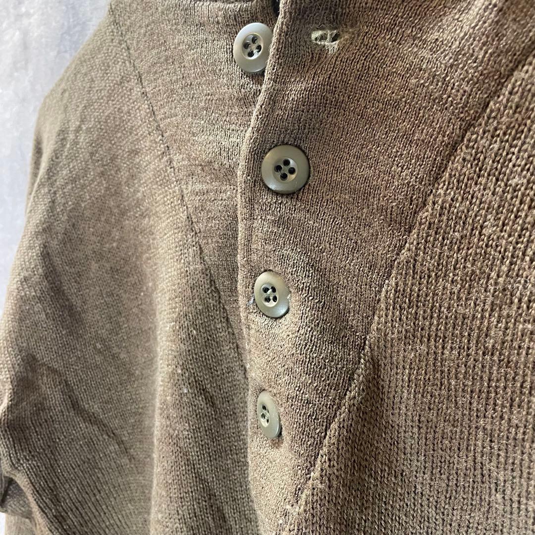 ミリタリー、オリーブ色のウールニットセーター、5つボタン付き、Lサイズ。