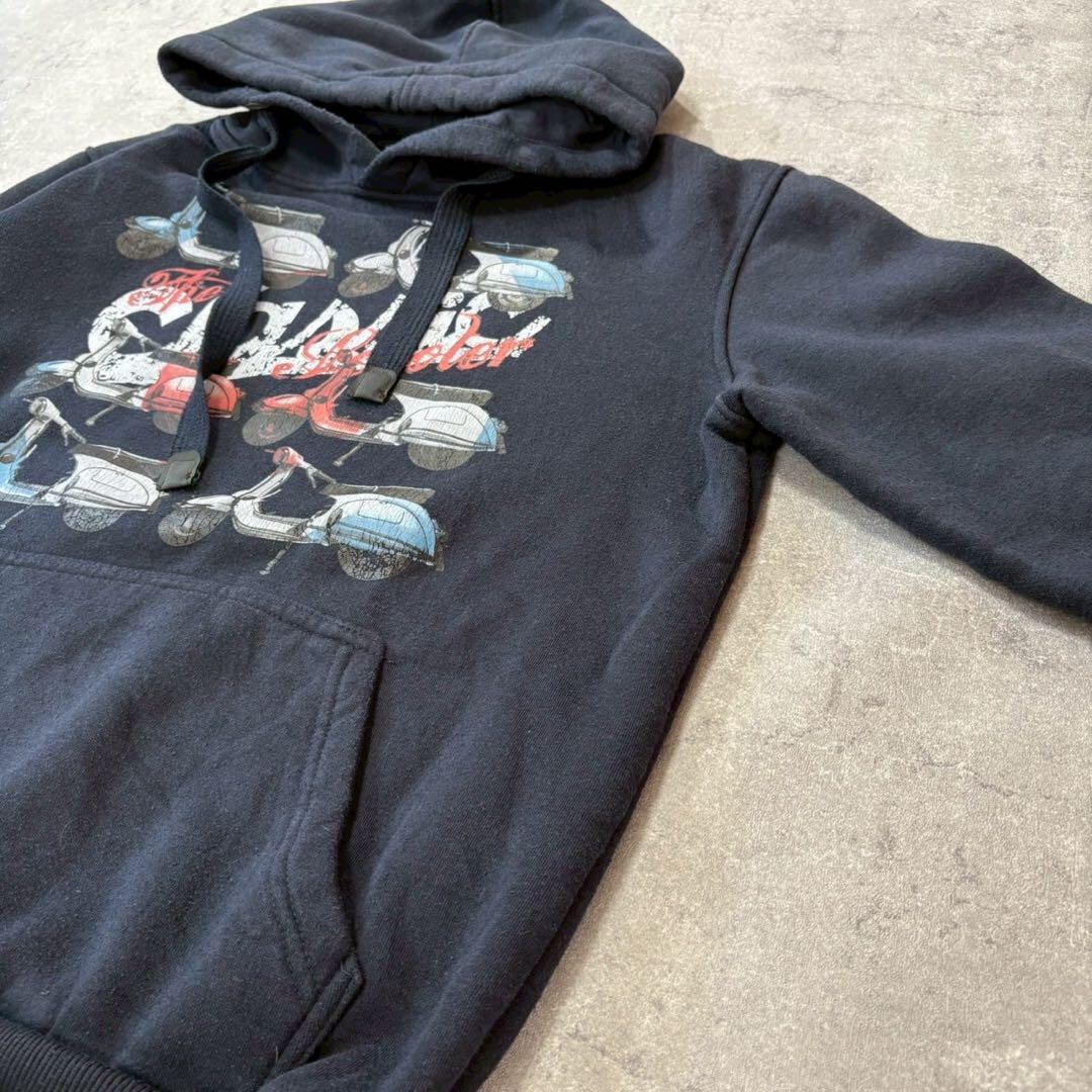 バイクのグラフィックが特徴的な黒のフード付きパーカー。