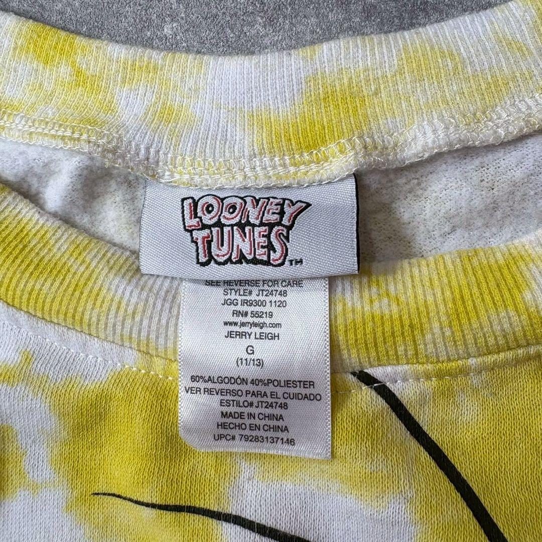 イエローとホワイトのタイダイプリントにローニー・テューンズのキャラクターがデザインされたトレーナー。