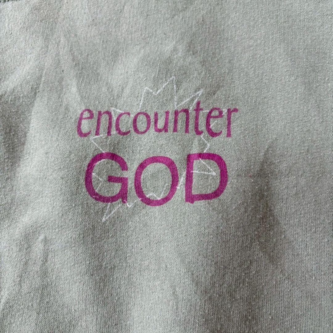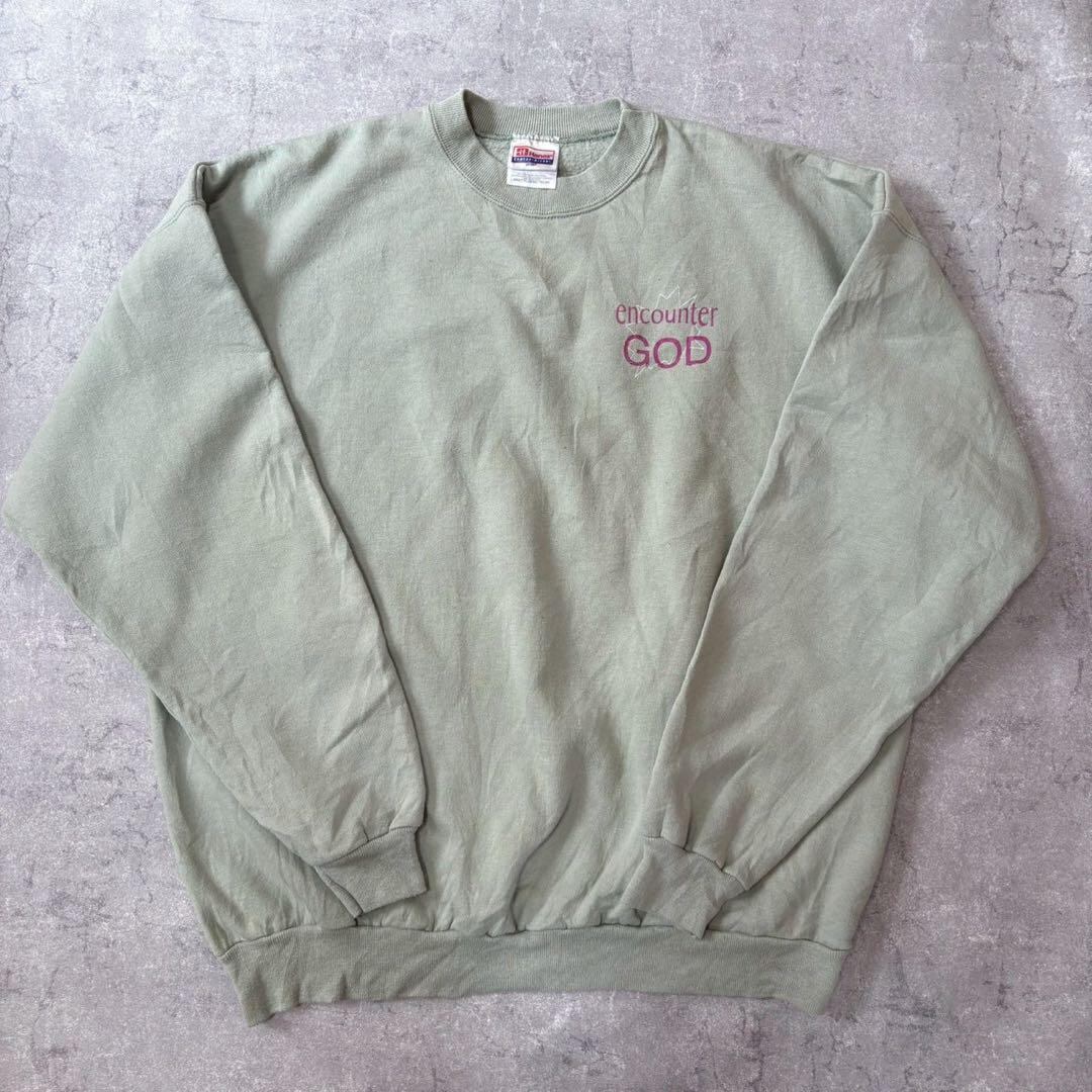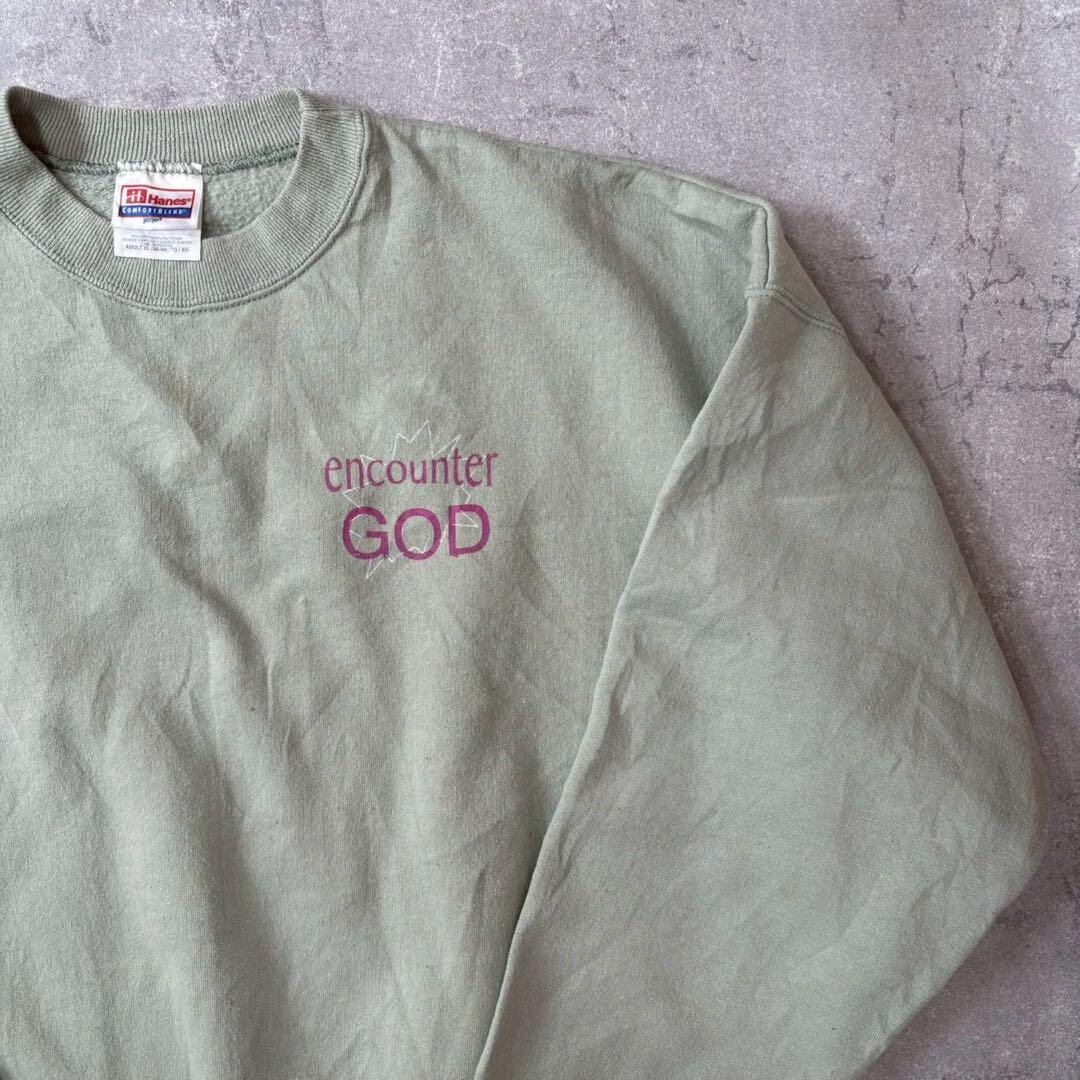 オリーブグリーンのHanes製トレーナー、Encounter GODのロゴ入り。