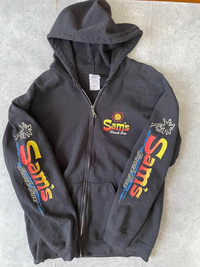 Sam's Beach Barのグラフィックが特徴の黒いジッパー付きパーカー。