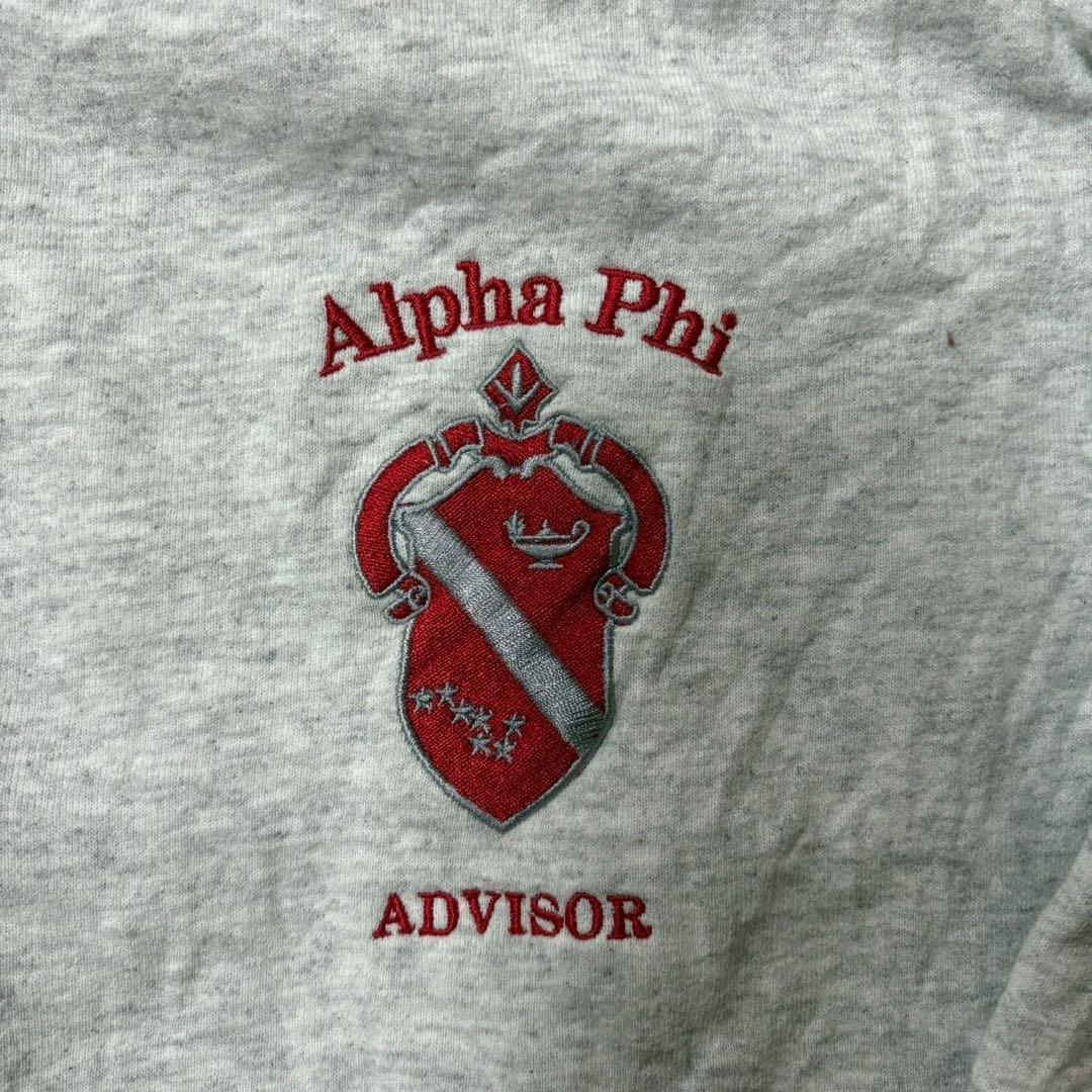 グレーのハーフジップスウェットシャツ、Alpha Phiの刺繍入り。