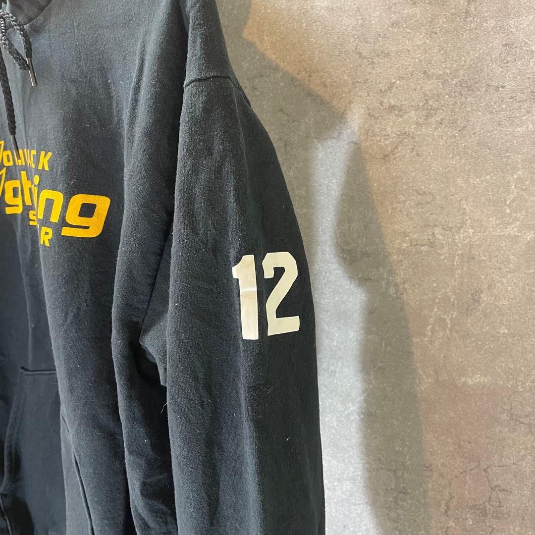 【商品説明】 Commack Lightning Soccerの黒いフード付きパーカー、番号12付き。