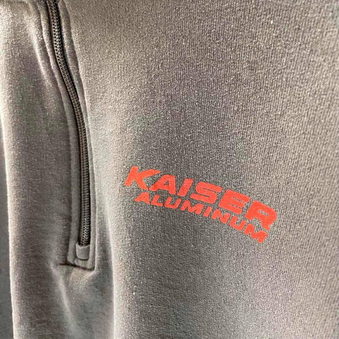グレーのハーフジップトレーナー、KAISER ALUMINUMロゴ付き。