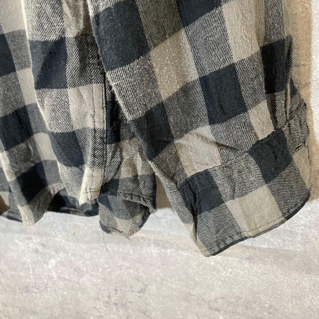グレーとブラックのチェック柄のフランネルネルシャツ、ボタンダウンデザイン。