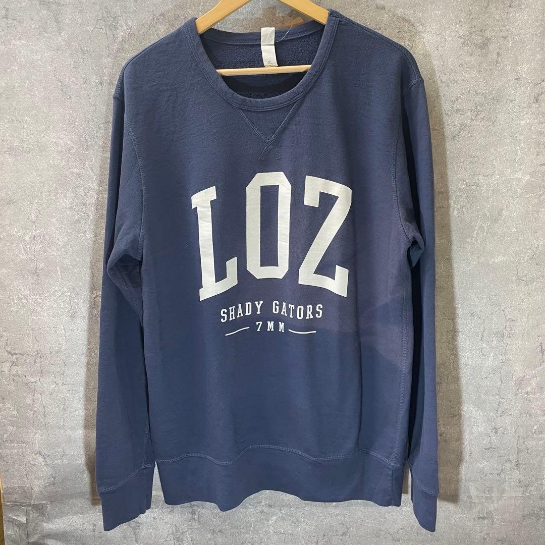 ネイビーのクルーネックトレーナー、LOZとSHADY GATORSのプリント入り。