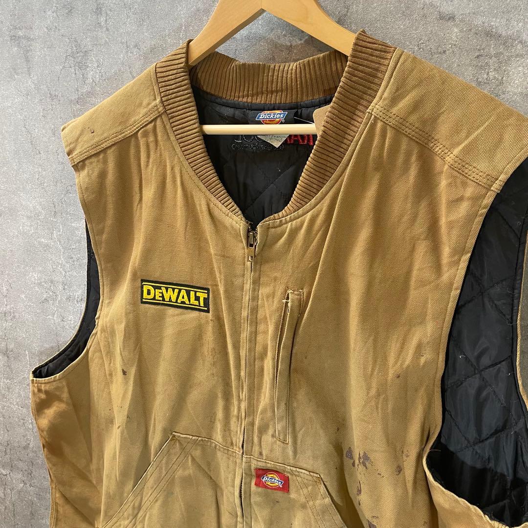 ディッキーズよりDEWALT刺繍のダック地ベスト、X-LARGEサイズ、ベージュ色、フロントジッパーとポケット付き。