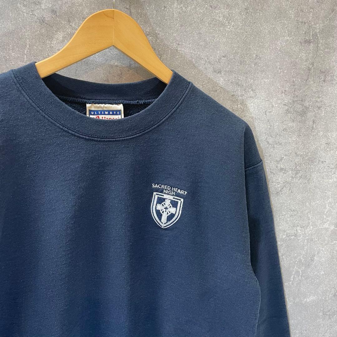 ネイビーのHanes製スウェット、エンブレム付きでカジュアルに最適。
