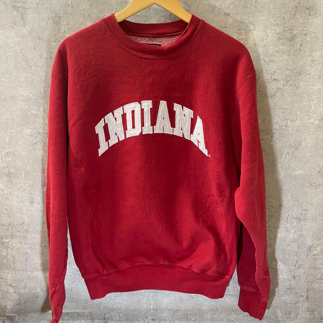 レッドのINDIANAプリント入りスウェットシャツ、サイズS、快適なコットン混紡素材。