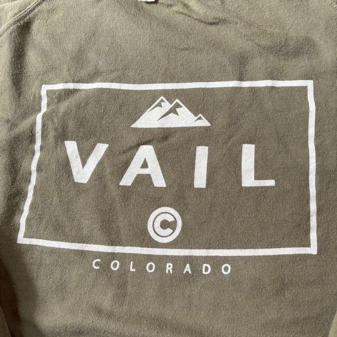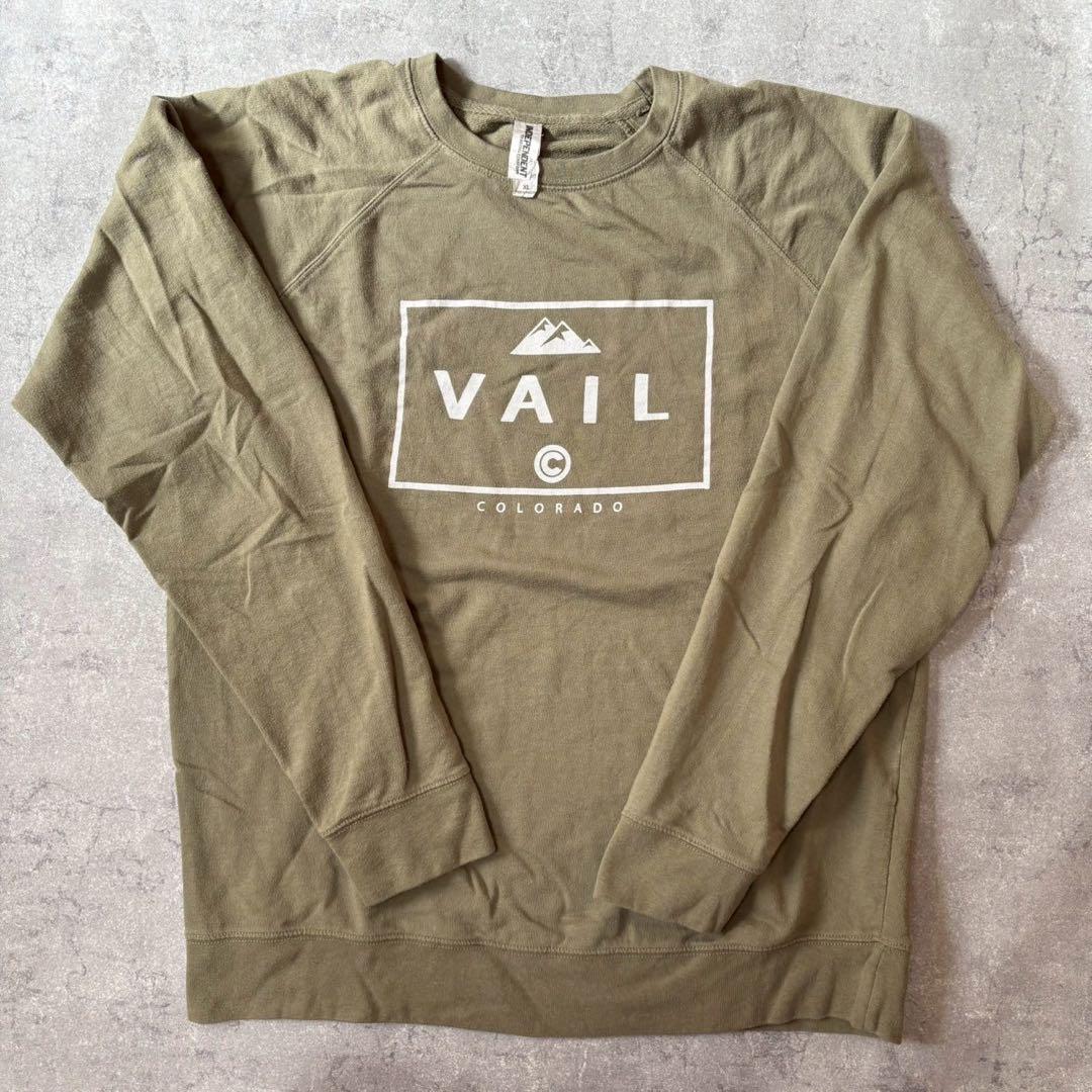 オリーブグリーンのVAIL COLORADOロゴ入りトレーナー、XLサイズ、ラグランスリーブデザイン。
