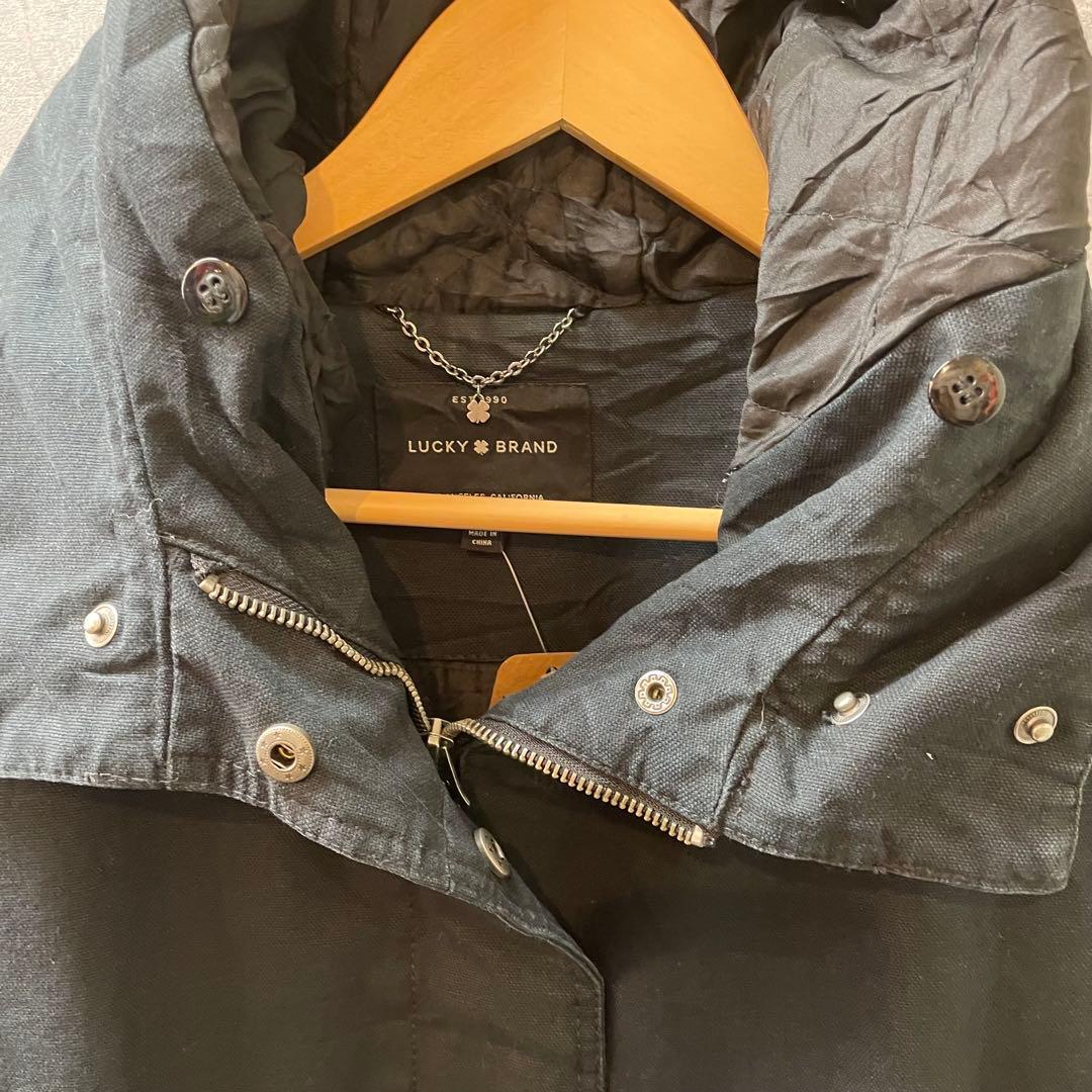 フード付きのブラックモッズコート、LUCKY BRAND製のLサイズ。