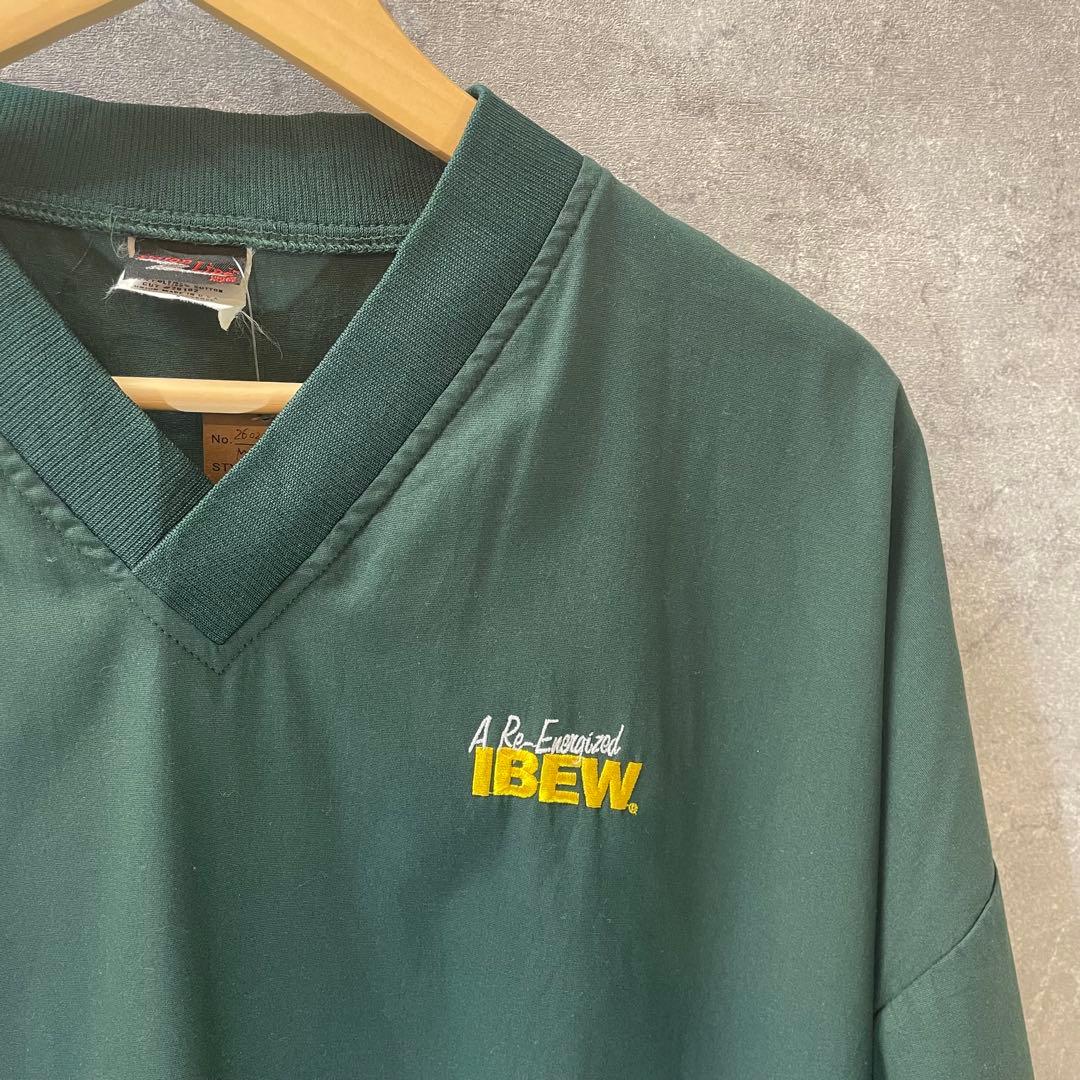 ダークグリーンのナイロンジャケット、IBEWロゴ入り、Lサイズ。