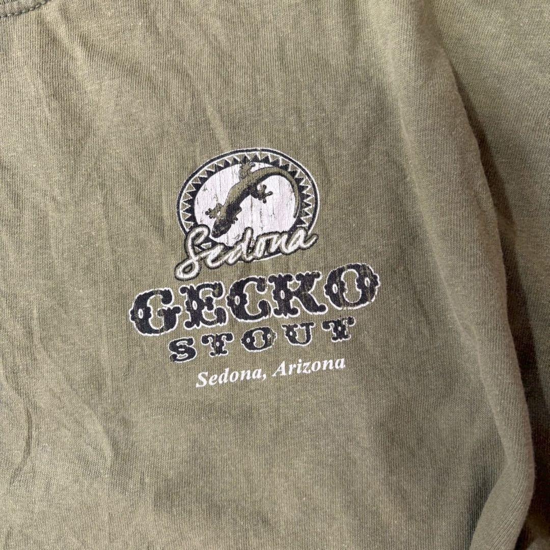 オリーブグリーンのGILDAN製Gecko Stout Tシャツ、XLサイズ、ユニークなプリントデザイン。