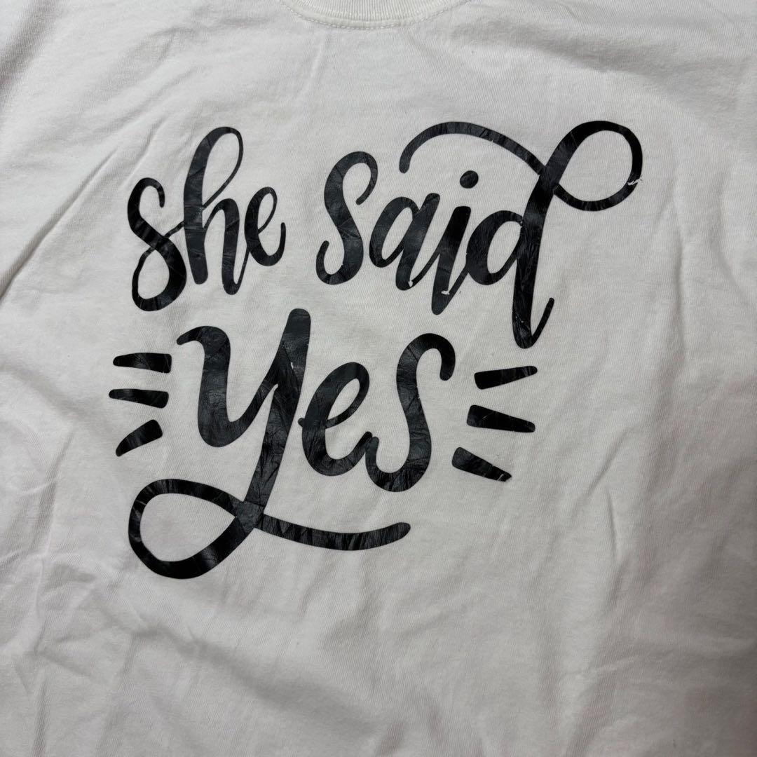 ホワイトTシャツにブラックの「she said yes」プリント。