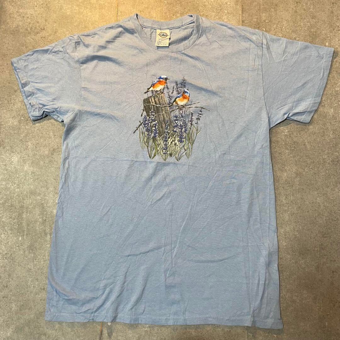 水色のTシャツに鳥と花のデザイン