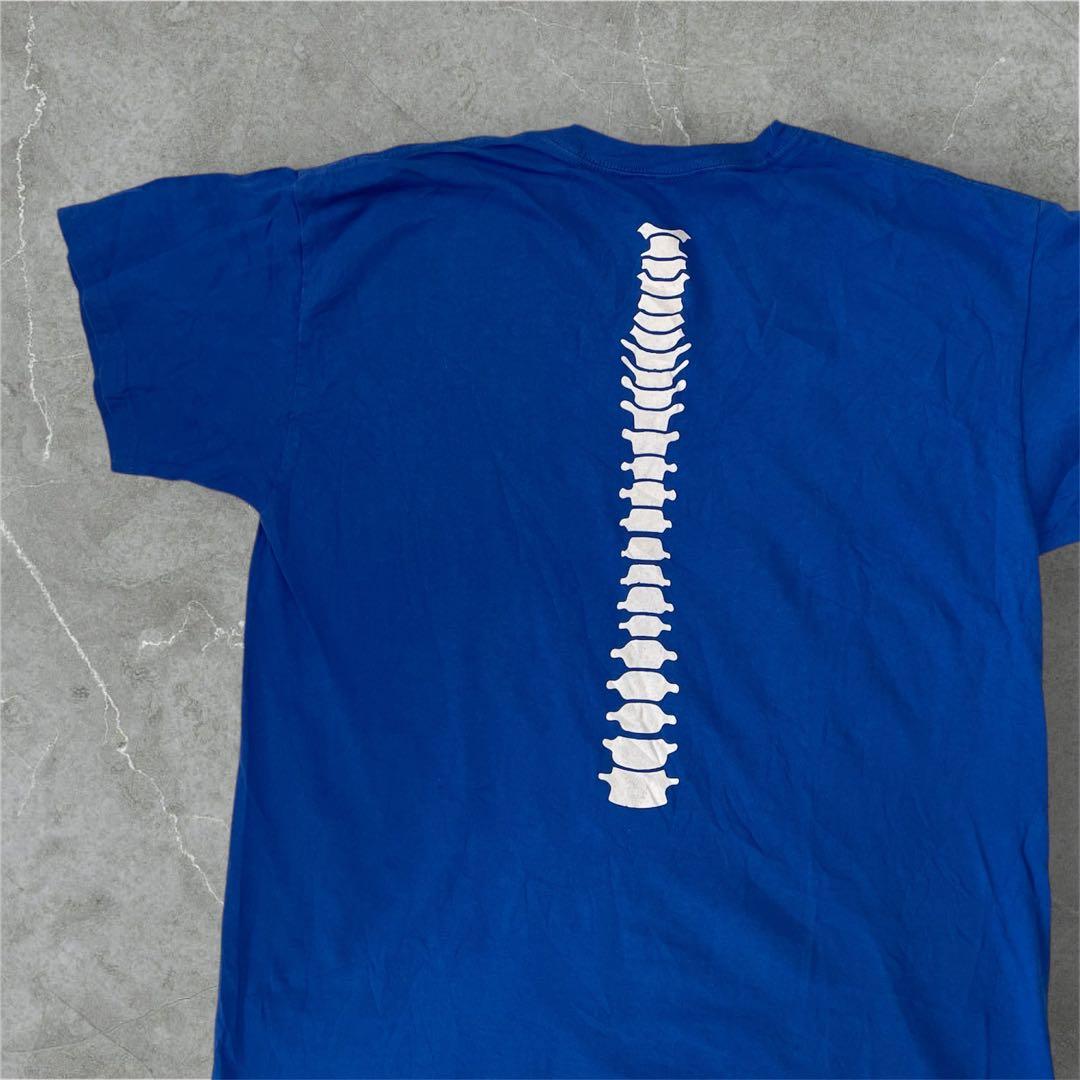 青色のTシャツに脊椎のデザインと「Wood River CHIROPRACTIC」のテキストが施されています。